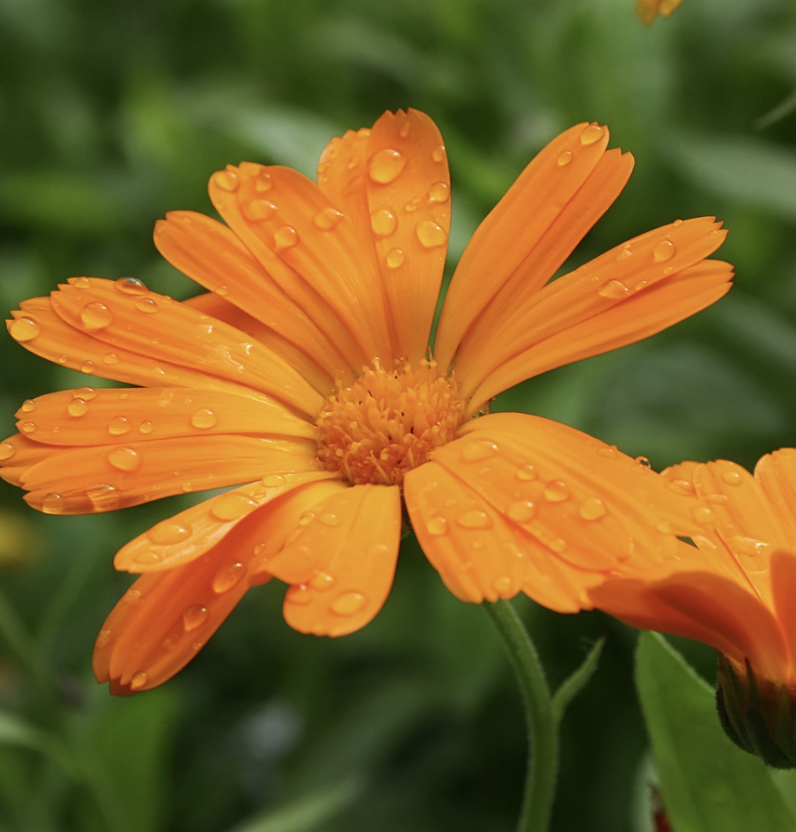 Calendula is a well-known herb and uplifting ornamental garden plant that has been used topically, ceremonially, and as a dye and food plant for centuries. It is also commonly referred to as marigold or pot marigold. Calendula is an annual herb bearing the characteristic daisy-like flowers of other members of the Asteraceae family, having bright orange or yellow terminal flower heads and pale green leaves. Native to Southern Europe, Egypt, the Mediterranean, and in the region spanning the Canary Islands to Iran, calendula is now naturalized in much of the world and is commonly grown in gardens.