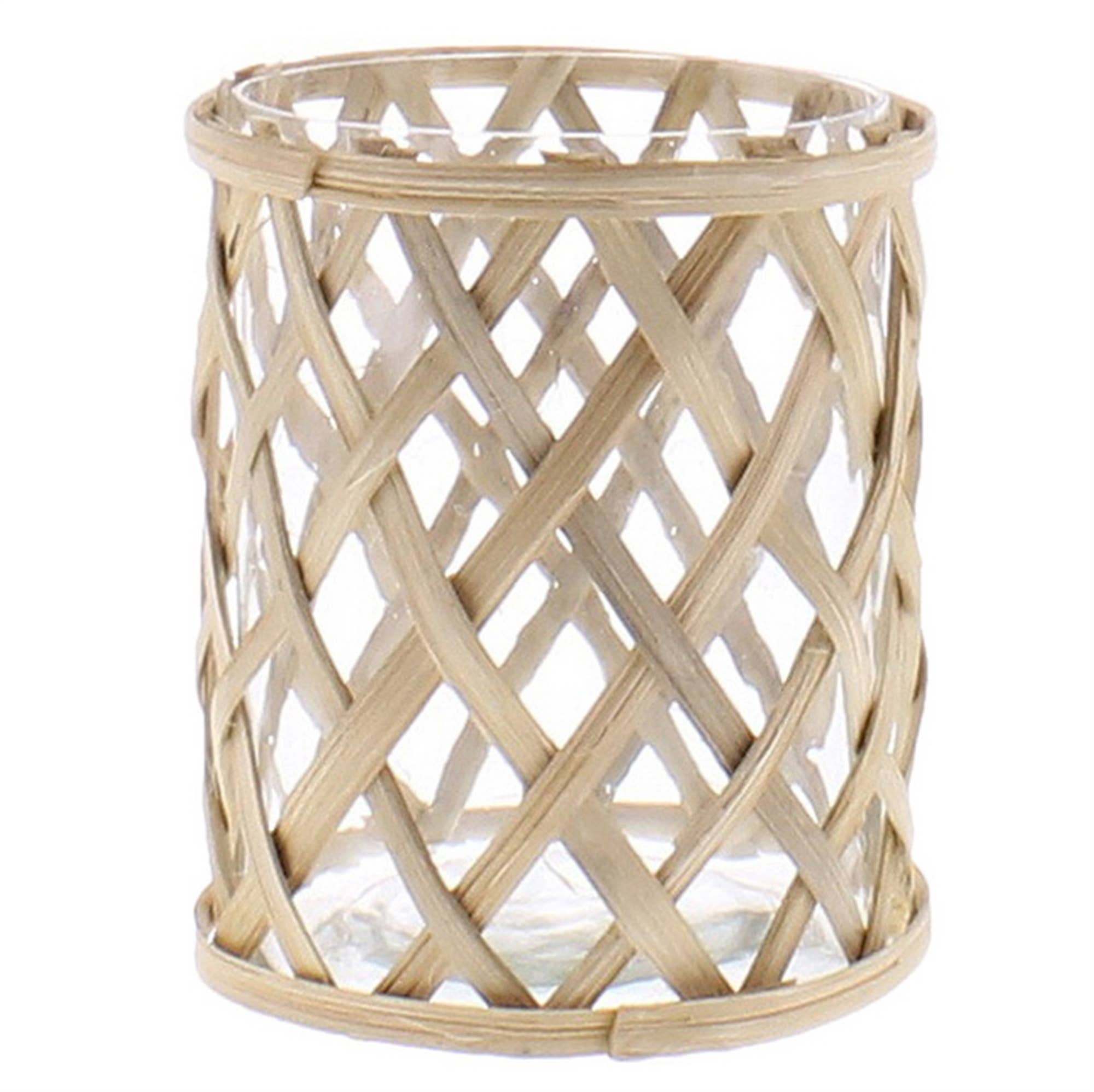 An intricate weave of thin bamboo dresses this clear glass vase made to house flower groupings and add warmth to any space.
