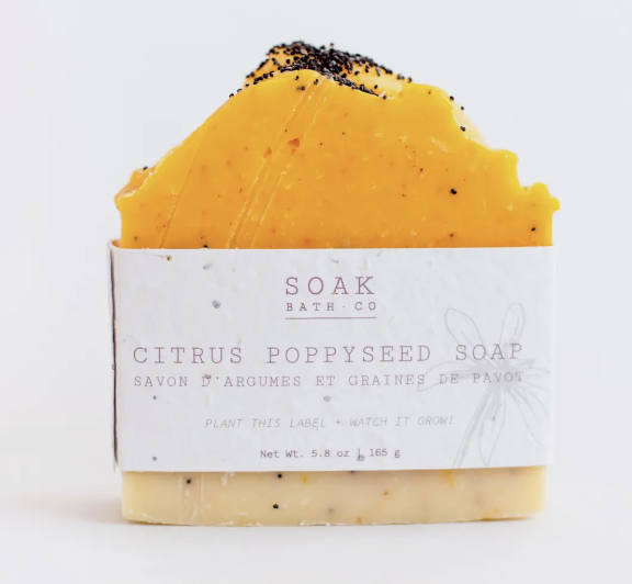 SOAK Bath Co’s Citrus Poppyseed Soap Bar is the perfect blend of cheery and bright! Infused with Lemon and Orange Essential Oils it’s a citrus combo we love especially as a kitchen sink soap bar! Sprinkled in are poppyseeds to create a natural exfoliation to help get the dirt off your hands after a day in the garden or washing up while preparing dinner. Recommended as a body hand soap bar. This gorgeous bar is completely zero waste and sustainable. The label on each SOAK Bath Co bar is made of biodegradable, plantable seed paper so you can plant the label and it will grow into wildflowers! SOAK Bath Co is a woman owned brand based in Manitoba, Canada. Each of our products is handmade by our local team of women in our Canadian studio with all natural, vegan-friendly ingredients. We believe in creating sustainable products that make the best gifts and you feel great using on your skin.