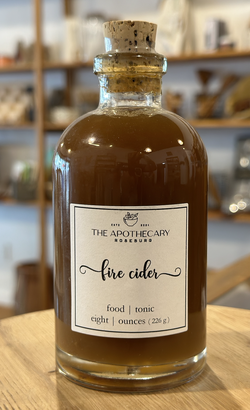 What is it? Well, Fire Cider is a tonic made by steeping citrus, ginger, garlic, onions, horseradish, turmeric and habanero (or jalapeno) peppers in apple cider vinegar for a minimum of six weeks. We like ours to sit for three months. What does it do? Its a homeopathic elixer! Fire cider is said to restore and invigorate one’s system, and additionally, many claim it has benefits that include boosting energy, warding off colds and flus, easing sinus congestion, lowering blood sugar, curbing cravings, and aiding digestion. Our Favorite ways to use:
