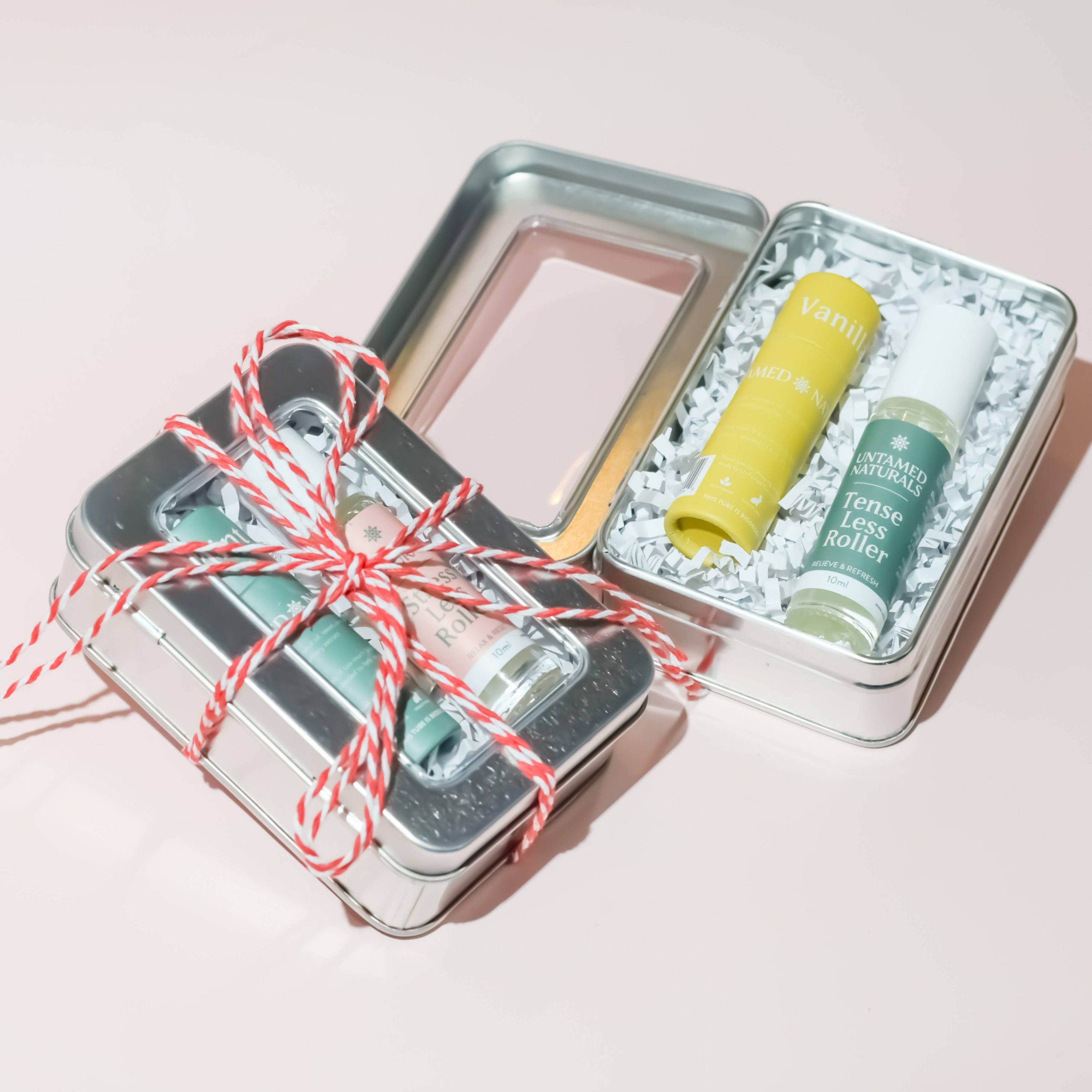 Tin box includes your choice of 1 Calendula Lip Balm and 1 Aromatherapy roller.