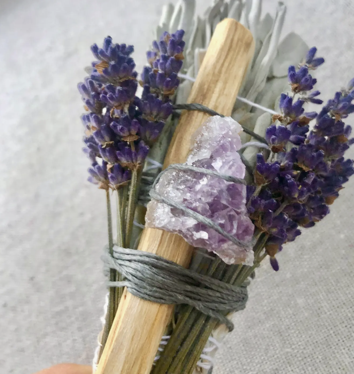 Look at these beautiful hand tied Sage, Palo Santo, Lavender and Amethyst crystal Smudge sticks.