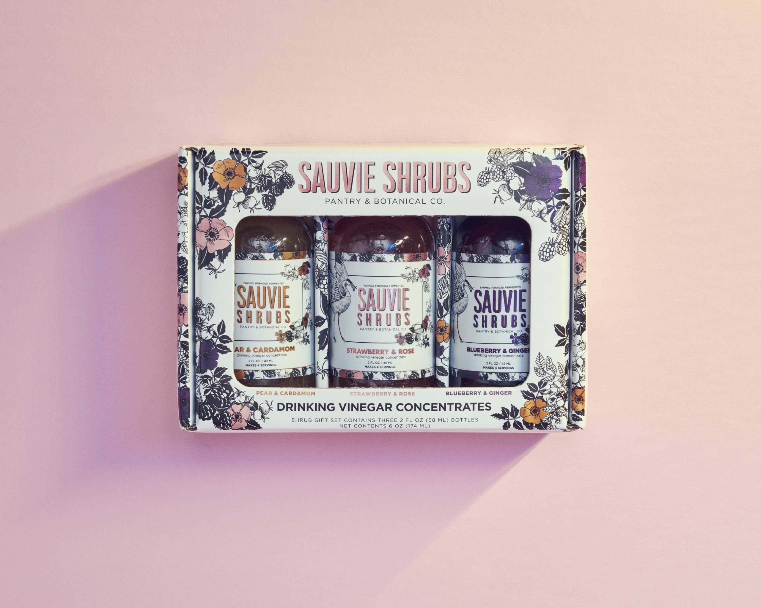 Try a sampling three signature shrubs in this beautiful botanical gift box. Each gift box contains three 2 oz bottles (4 servings each) of our Pear Cardamom, Strawberry Rose, and Blueberry Ginger shrubs as well as three unique recipes for a marinade, cocktail, and salad dressing. This shrub sampler is perfect for those that are new to shrubs and also makes an excellent gift.